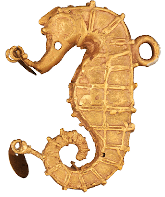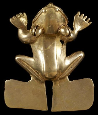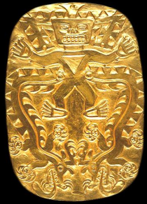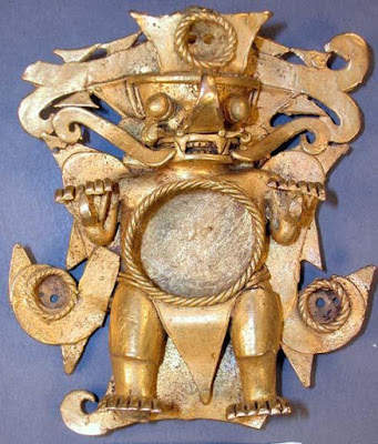 Human effigy pendant of gold, copper, silver alloy, Sitio Conte, Panama, ca. 700-900CE. | Large golden plaques and pendants with animal-human motifs were found, precious and semi-precious stone, ivory, and animal bone ornaments, and literally tons of detail-rich painted ceramics.