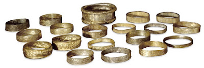 ![]() | ![]() | The hoard is made up of gold and silver coins and jewellery, amounting to 3.5 kg (7.7 lb) of gold and 23.75 kg (52.4 lb) of silver. |