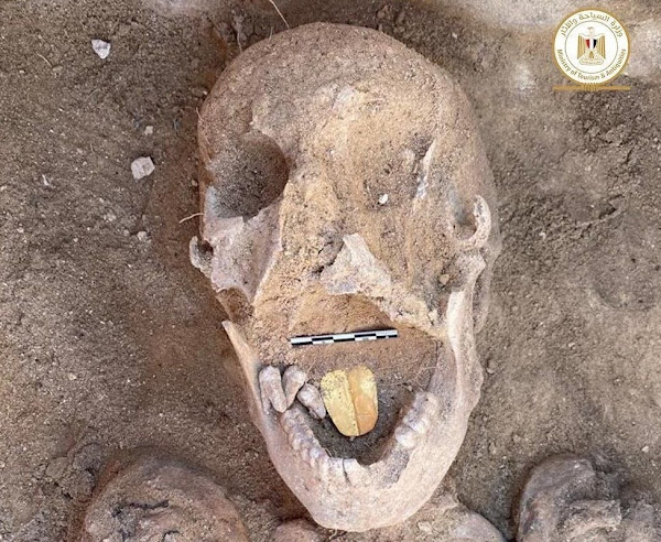 | Archaeologists have unearthed 2,000-year-old mummies with golden tongues at Alexandria's Taposiris Magna temple. 16 burials in rock-cut tombs contained poorly preserved mummies. It's thought the dead were given gold foil amulets shaped like tongues so that they could speak before the court of the god Osiris in the afterlife. Osiris was lord of the underworld and judge of the dead. |