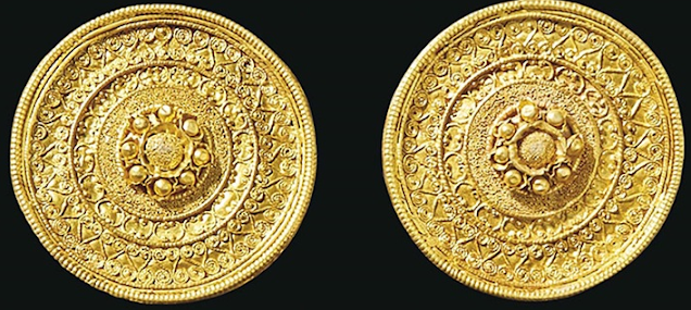 ![]() A pair of Etruscan gold ear studs. C. 530-500 BC. Estimate: $30,000-50,000. | ![]() A Greek gold olive wreath. Late classical period to early hellenistic. Estimate: $250,000-350,000. |