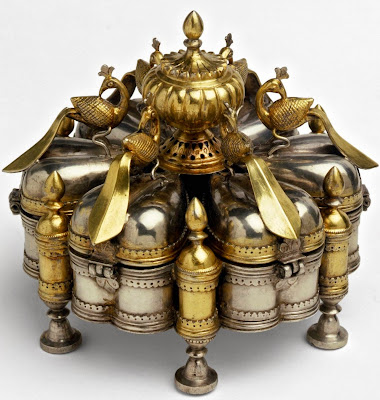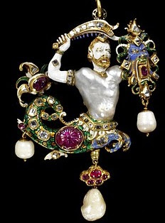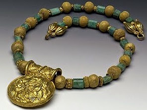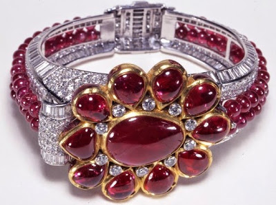 Mughal gold pendant inlaid with flat-cut rubies and emeralds and a large faceted diamond.