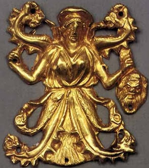 Gold Scythian belt title, Azerbaijan, 7th century BC. | ![]() | ![]() Scythian goddess Apa from the Kul Oba kurgan. |