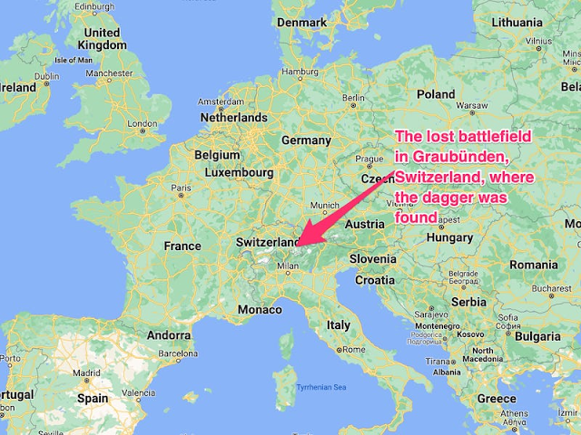 ![]() | A volunteer archaeologist using a metal detector in Switzerland uncovered a 2000-year-old dagger (pugio) in 2019. Due to its cross-shaped handle, the dagger can be dated back to 50 BC. Daggers of this type are rare. Only four are known. The dagger was found in the mountainous Graubünden region of Switzerland, an area believed to be the site of battle where Imperial Roman soldiers fought Rhaetian warriors in 15 BC. His discovery sparked an excavation of the area that revealed a trove of ancient military artifacts including lead slingshot and hobnails from soldiers' boots. A Roman coin minted between 29 BC and 26 BC during the reign of Emperor Augustus was found. |