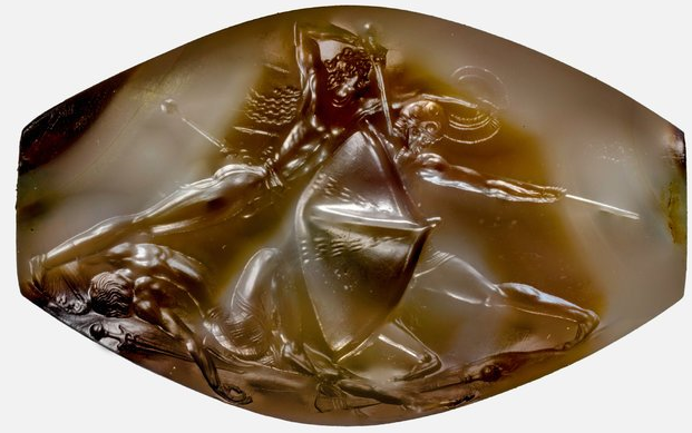 | Archaeologists excavating an ancient grave at Pylos in southwestern Greece in 2016 found a seal stone, a gemstone engraved with a design that can be stamped on clay or wax. The seal stone’s image is a striking depiction of one warrior in battle with two others. It is carved in fine detail. The seal stone’s owner, known as the Griffin Warrior, was buried around 1450 B.C. He lived at a time when the Minoan civilization of Crete was being transferred to cities of the Greek mainland. The sealstone is one of the finest works of prehistoric Greek art ever discovered. The tomb also revealed more than 3,000 objects arrayed on and around the warrior’s body. |